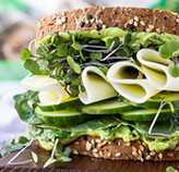 Divide the following equally, and top two of the slices with: spinach, cucumber slices, provolone cheese, and microgreens. Top each sandwich with the remaining slice of bread.