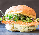 Generously spread mayonnaise on the bottom of the burger bun, place a salmon fillet on top, top with spicy microgreens and top all that with the upper part of the burger bun.
